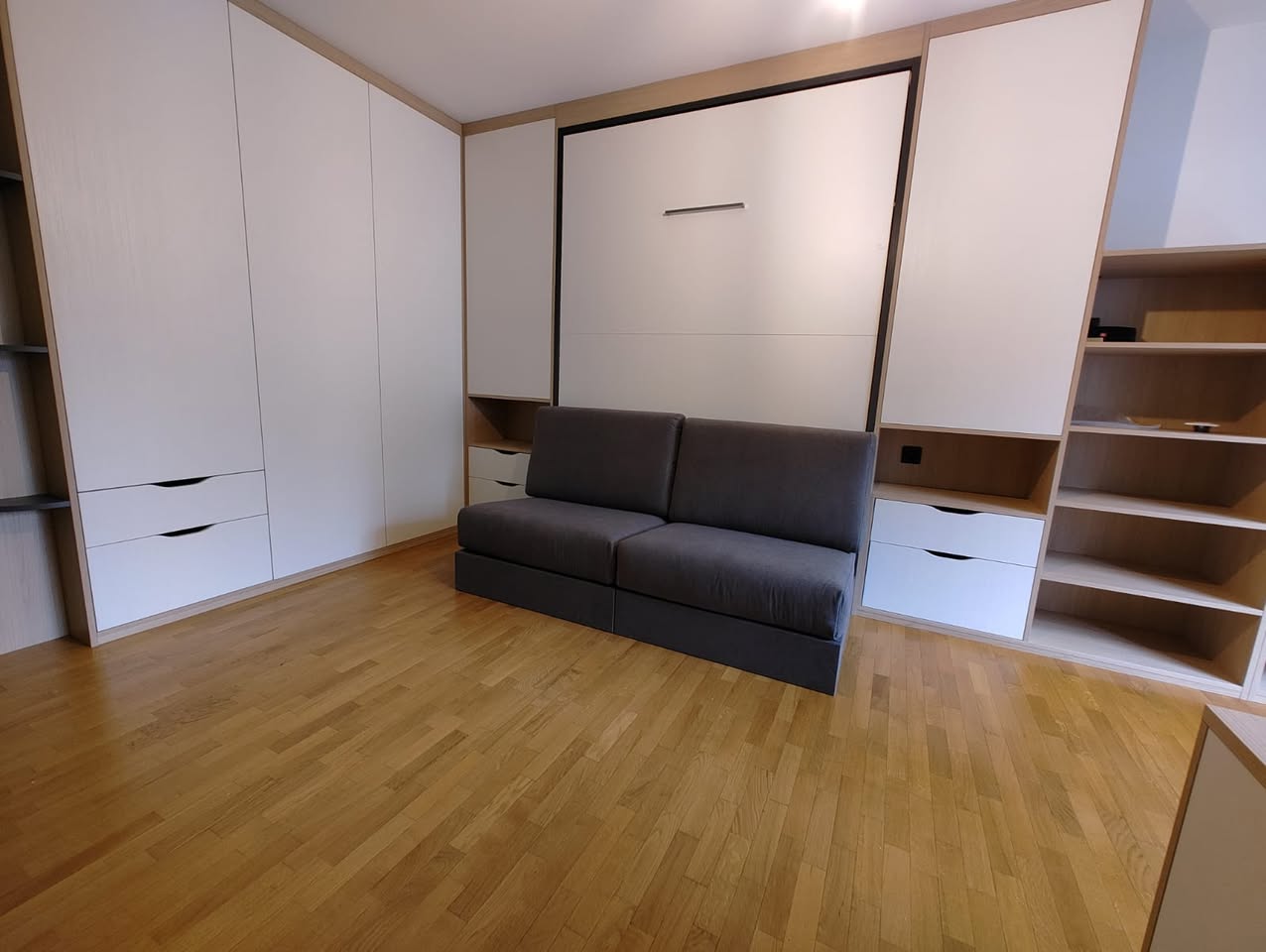 Dans le cadre de ce projet, nos clients souhaitaient repenser entièrement une pièce afin de lui donner plusieurs fonctions, sans compromettre le confort ni l’esthétique. L’objectif était clair : créer un espace polyvalent sur mesure, capable d’accueillir à la fois du rangement, un bureau, un espace TV et un couchage d’appoint.